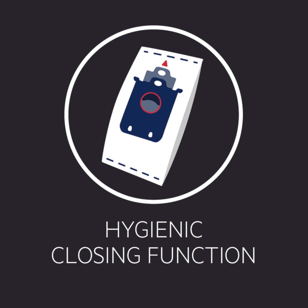 • De hygiënische sluiting sluit automatisch en zorgt ervoor dat er geen resten uitvallen wanneer de zak verwijderd wordt