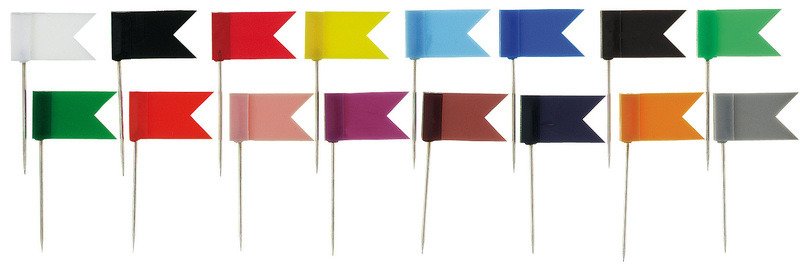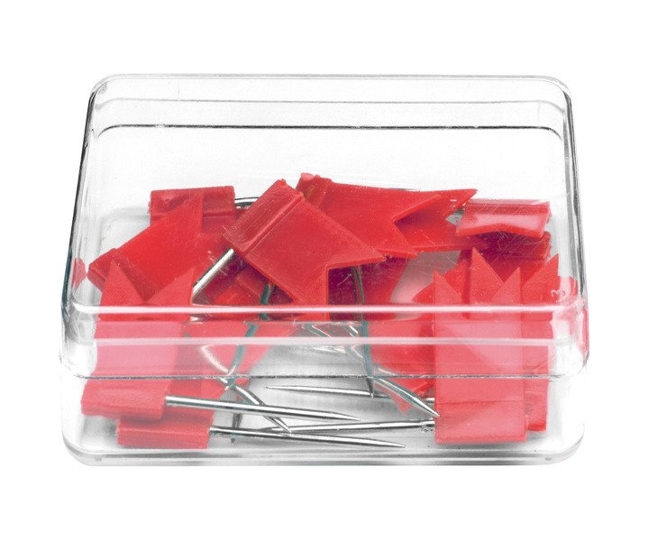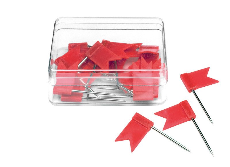 Deze markers in de vorm van vlaggetjes ‘wapperen in de wind’. Je kunt ze gebruiken als markeringsvlaggetjes om bijvoorbeeld aan te geven waar je geweest bent op de wereldkaart. Deze signalisatiespelden zijn geschikt om in een prikbord of andere zachte ondergrond te prikken. 20 stuks in doosje. Kleur rood.