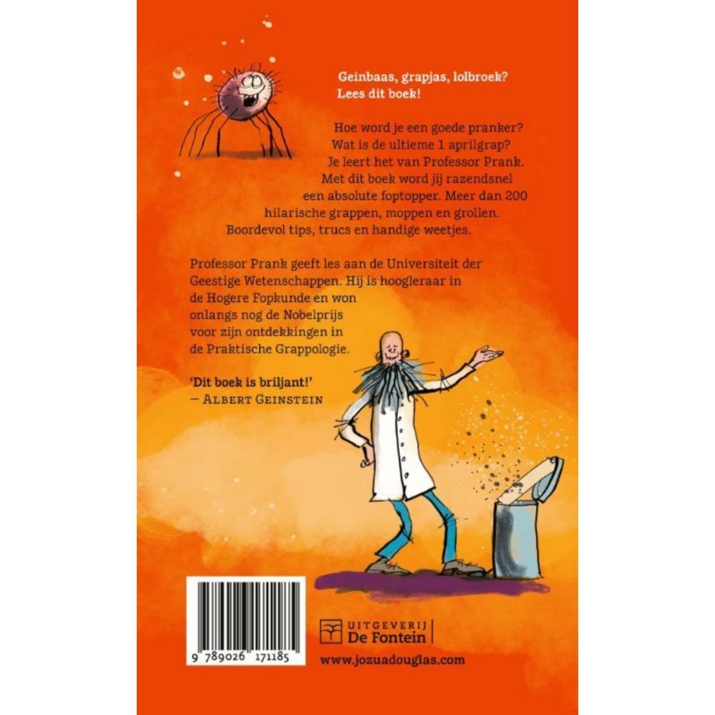 Hoe word je een goede pranker? Wat is de ultieme 1 aprilgrap? Je leert het van professor Prank. Met dit boek word jij razendsnel een absolute foptopper. Een must-have voor grapjassen, lolbroeken, pretspetters en andere geinbazen. (NIET VOOR OUDERS!!!) Professor Prank geeft les aan de Universiteit der Geestige Wetenschappen. Hij is meester in de Hogere Fopkunde en won onlangs de Nobelprijs voor zijn ontdekkingen in de Praktische Grapologie. Met omkeerbaar stofomslag!