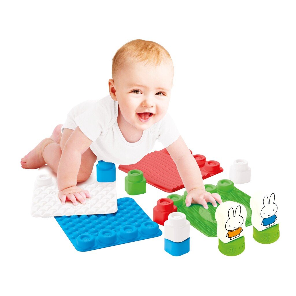 Een reis van de tastzin die wordt gemaakt door te bouwen met maxi stukken van zacht, veilig en niet-giftig rubber, met nijntje personages, ontworpen om een boeiende ervaring voor baby’s te creëren. Het oppervlak van de stukken heeft verschillende reliëftexturen om de tastzin van het kind te stimuleren. Dankzij de Clemmy-vormen op de stukken kan het kind met plezier de blokken in elkaar passen om allerlei torens te bouwen.
