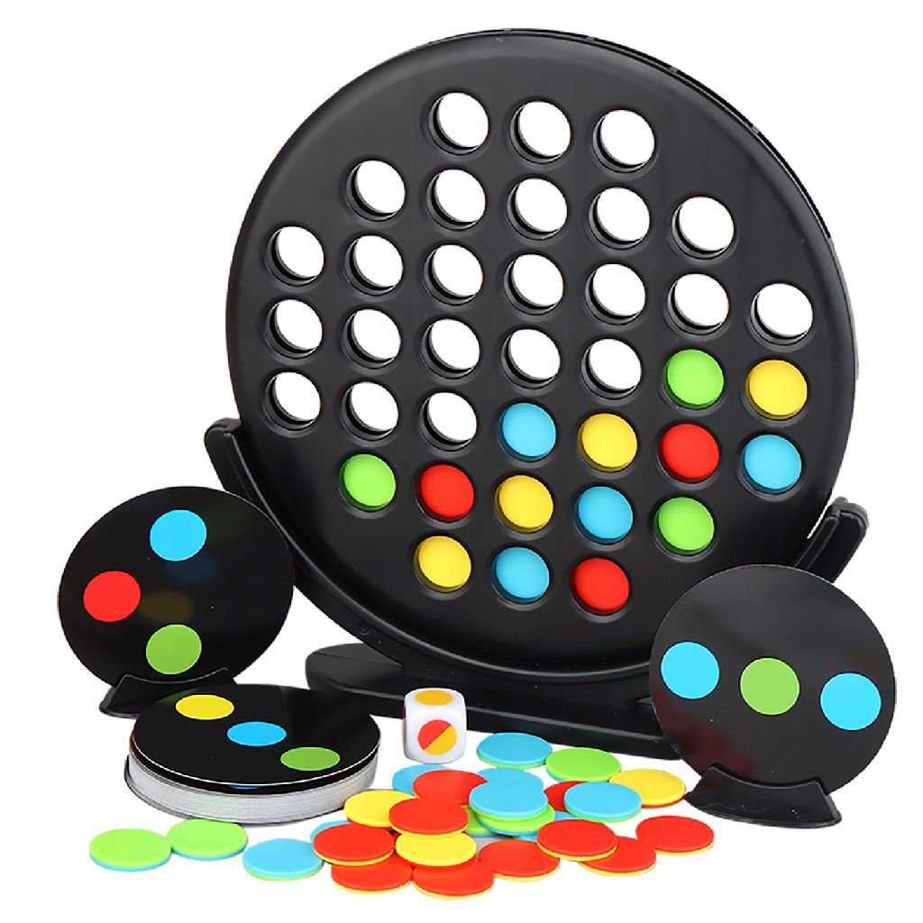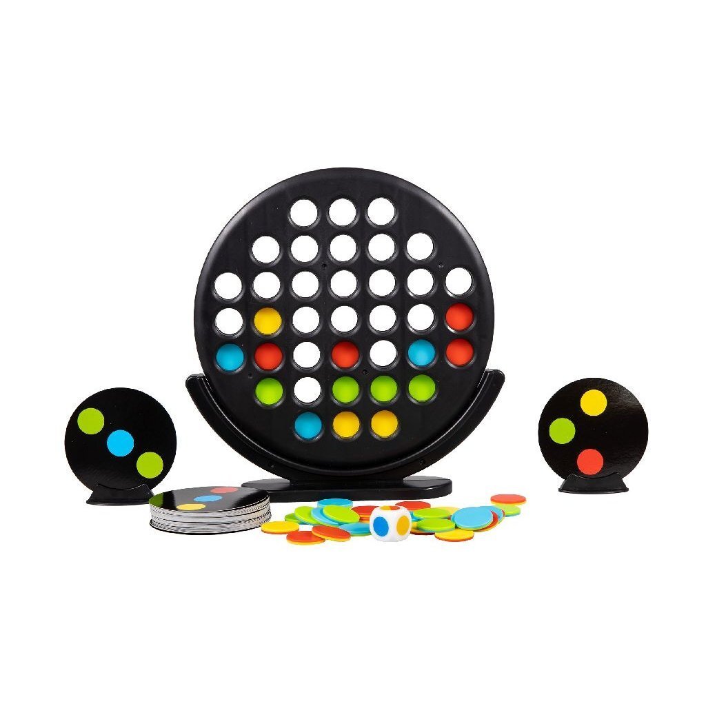 Zie jij al dubbel? Bij dit spel zal dit je helpen! Bij dit spel krijgen beide spelers dezelfde opdrachtkaart, met een patroon in verschillende kleurtjes. De spelers mogen om de beurt een schijf in het speelbord laten vallen. Om de kleur van de schijf te bepalen, gooi je met de dobbelsteen. De opdrachtkaart is dubbelzijdig en heeft aan beide kanten andere kleurtjes. Maar dat hebben de schijven ook, waarmee je speelt. Als je dus zelf een stap verder komt in het samenstellen van het patroon op het kaartje, komt je tegenstander het ook! Zoek het patroon in een willekeurige richting om een match te maken en de opdrachtkaart te claimen. De eerste speler, die 5 kaartjes heeft verzameld, wint het spel!