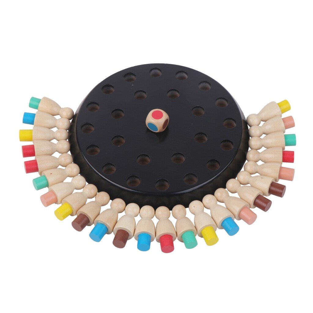Plaats alle pionnen willekeurig op het Houten bord en onthoud welke kleur ze hebben. Rol met de dobbelsteen en probeer de pion met de kleur die je rolt van het bord te pakken. Pak je de juiste pion, dan is deze van jou en mag je doorspelen! De speler met de meeste pionnen wint. Inhoud: Spelbord, 24 gekleurde pionnen en een dobbelsteen met kleurvlakken. Diameter bord: 18 cm. Geschikt voor 2 spelers vanaf 5 jaar.