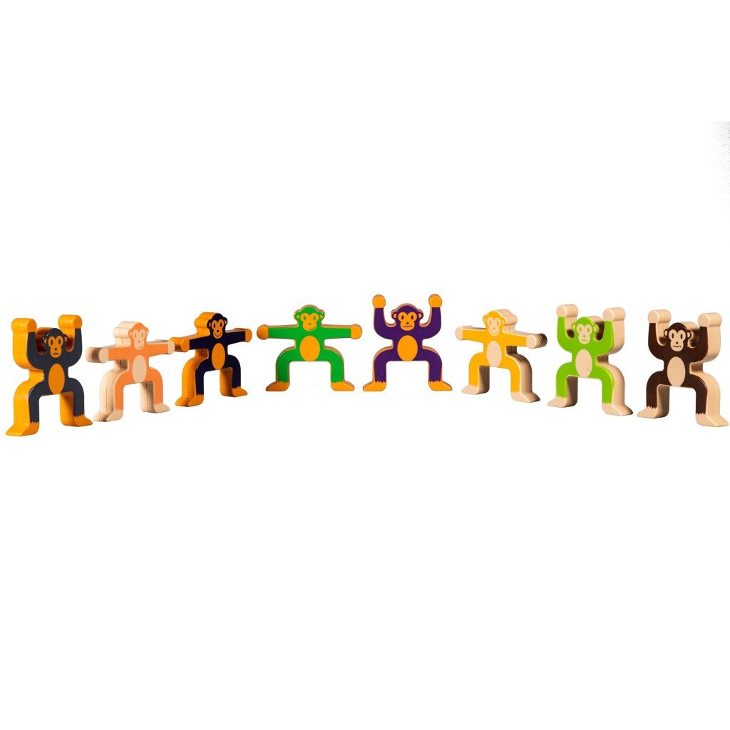 Clown Games Monkey Balance. Maak de mooiste en hoogste bouwwerken met deze grappige aapjes! Er zijn 8 verschillende soorten, en je mag zelf kiezen welke variant je pakt. Tijdens het bouwen ontwikkelen kinderen hun creativiteit en ruimtelijk inzicht. Hoe meer aapjes je als basis gebruikt, hoe gemakkelijker je erop verder kunt bouwen. Daag jezelf uit door een zo smal mogelijke basis te gebruiken! Je kunt dit spel alleen spelen, maar ook met zijn tweeën. Wie dan de toren met aapjes laat vallen, heeft het spel verloren. Inhoud: 16 aapjes. Geschikt voor 1 of 2 spelers vanaf 5 jaar.