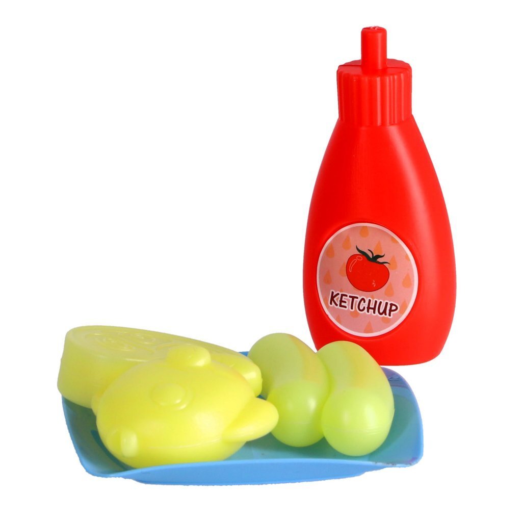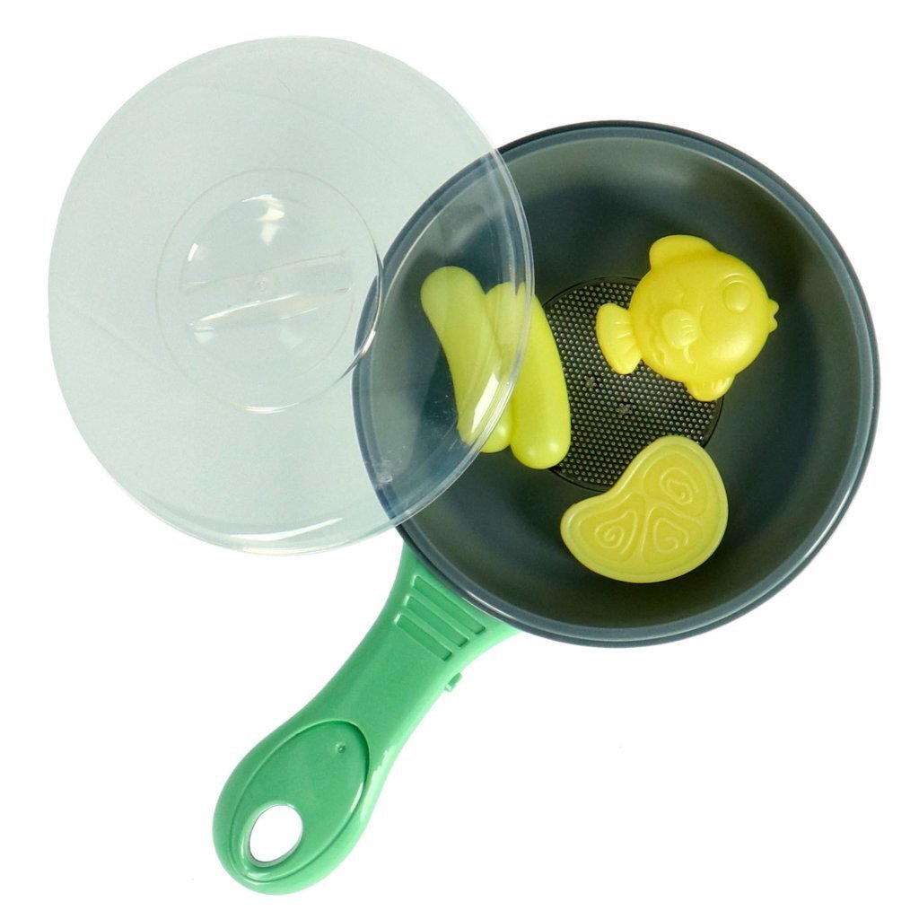 Leuke speelset bestaande uit een elektronische koekenpan met deksel (mintkleur), een bordje, een flesje ketchup, een steak, een visje en 2 worstjes. De worstjes, vis en steak veranderen van kleur wanneer ze warmer worden. Batterijen (2x AAA) niet inbegrepen. Geschikt voor kinderen vanaf 3 jaar.