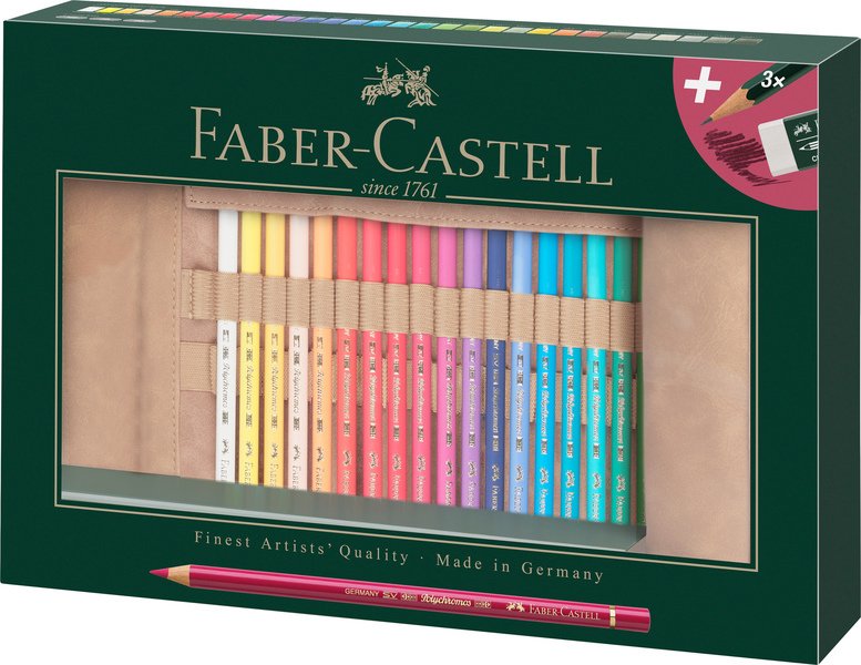 Kwalitatief hoogwaardige roletui. Gevuld met 30 Polychromos kleurpotloden, 3 grafietpotloden (9000) en gum. Kleurpotloden, 3,8 mm kerndikte in hout gevat, ronde uitvoering. Hoogwaardige pigmenten met voortreffelijke kleurkracht en lichtbestendigheid. Volledige kleurafgifte en soepel werkend. Wis- en watervast. Alleen met terpentine verwijderbaar. Houder gelakt in de kleur van het potlood.