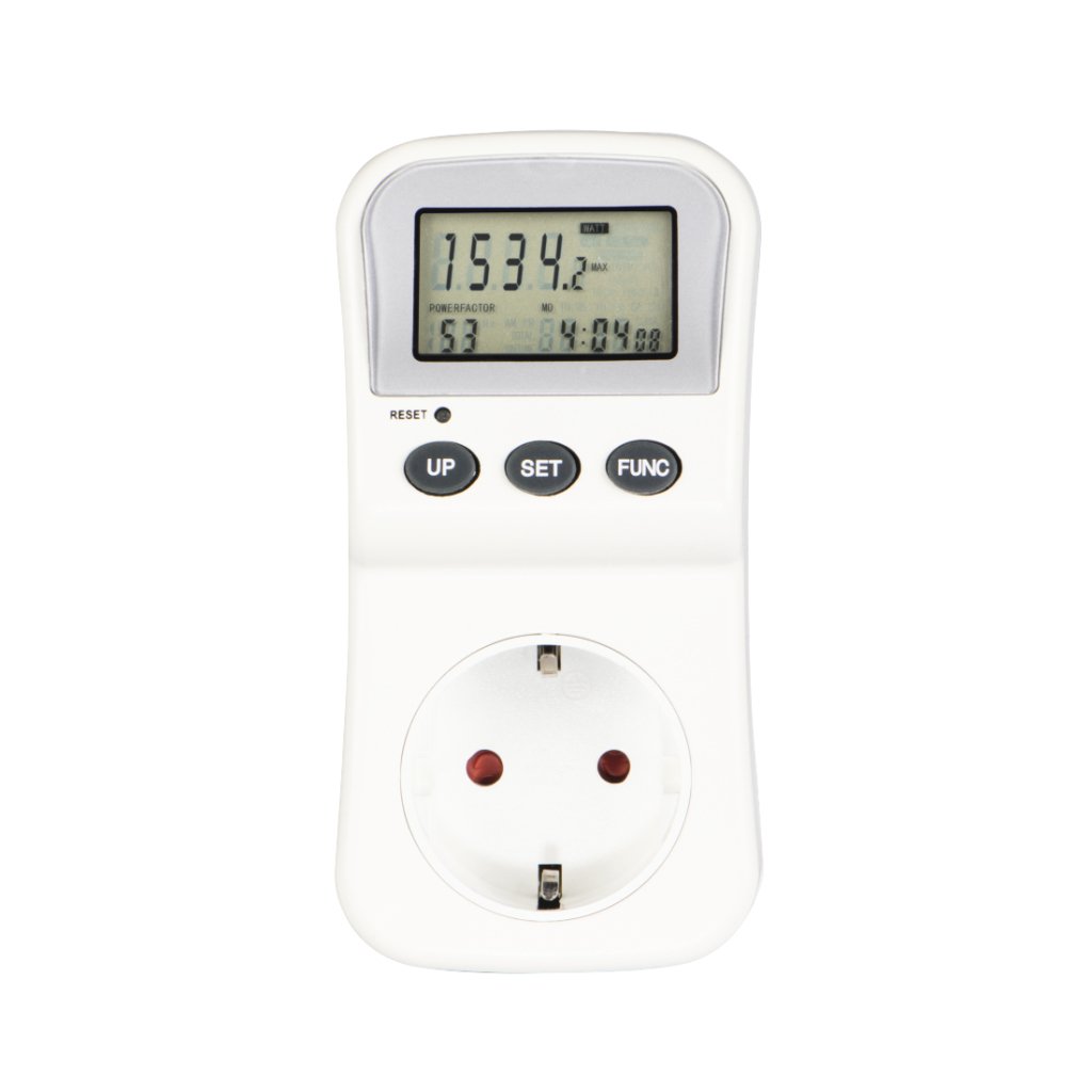 - Praktisch meetapparaat voor het meten en weergeven van tijd, spanning, frequentie, stroom, vermogensfactor, (min. en max.) vermogen en energiehoeveelheid