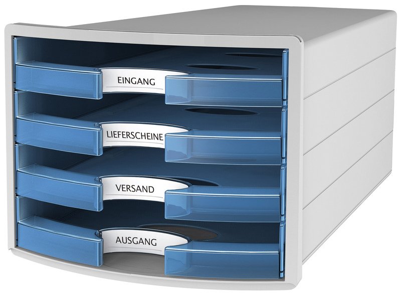 Ladenkastje van antistatisch polystyrol. Lichtgrijze ombouw met 4 open laden. Voor het bewaren, verzamelen of sorteren van al uw bescheiden die u op uw werkplek onder handbereik wilt hebben. Laden voorzien van uittrekblokkering, met elegant geïntegreerde labelhouders. Beschrijfbare labels worden meegeleverd. Het zeer stabiele ladekastje staat op 4 rubberen voetjes en is tevens geschikt om er een beeldscherm op te plaatsen. Afmetingen ladekastje: 280x367x235mm (bxdxh), binnenmaat lade: 240x325x37mm (bxdxh). Verpakt per stuk in een doos. Kleur blauw transparant.