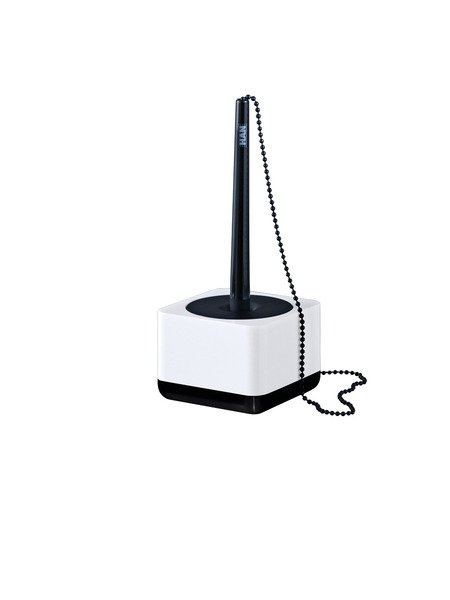 De iLine pennenstandaard kenmerkt zich door een stabiele uitvoering en mooie vorm. Door de rubberen afwerking aan de onderzijde wordt het meubel beschermt tegen krassen en kan het niet wegglijden. Er wordt gebruik gemaakt van documentechte inkt (ISO 12757). De pen zit bevestigd met een elegante en robuuste metalen ketting (70 cm). Kleur wit/zwart.