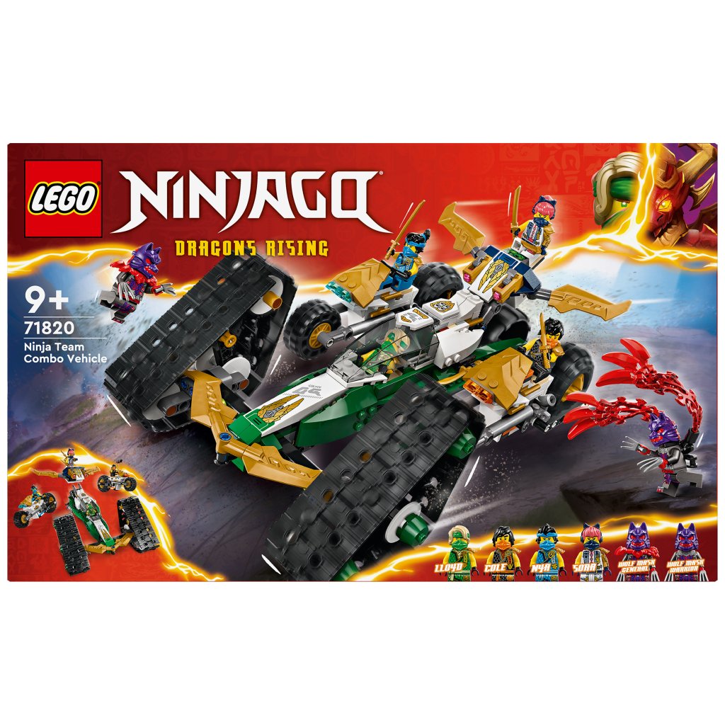 Kids kunnen avonturen boordevol actie uit seizoen 2 van de tv-serie NINJAGO Dragons Rising naspelen met dit 4-in-1 avonturenspeelgoed met het Ninjateam combivoertuig (71820). Kinderen kunnen met het grote NINJAGO voertuig spelen voordat ze het splitsen in 4 kleinere voertuigen: Sora's zweefvliegtuig met 2 noppenschieters, Lloyd's offroad racewagen en Cole en Nya's motoren. Deze voertuigspeelset bevat 6 NINJAGO minifiguren: de ninja's Sora, Lloyd, Nya en Cole, gekleed in hun speciale toernooiuitrusting en gewapend met katana's, en hun rivalen: een Wolvenmasker strijder en Wolvenmasker generaal. Het LEGO NINJAGO assortiment met bouwbaar ninjaspeelgoed omvat draken, voertuigen en tempels, zodat fans avonturen kunnen naspelen met hun helden. Elke ninjaspeelset kan in elkaar worden gezet met behulp van de LEGO Builder app, die jou en je kind begeleidt op een eenvoudig en intu?tief bouwavontuur. Zoom in en draai modellen in 3D, sla sets op en houd je voortgang bij. 576-delig. Geschikt vanaf 9 jaar.