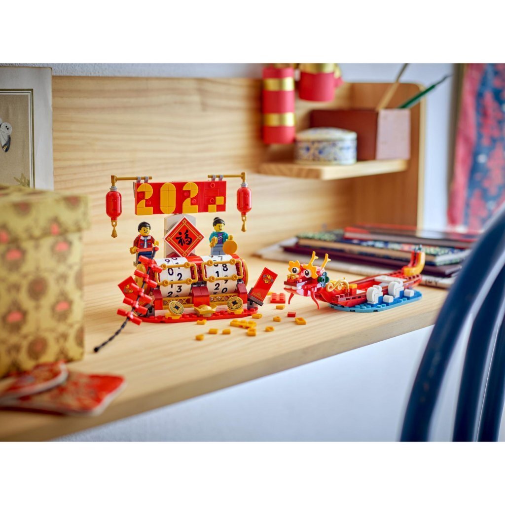 Deze kalender om zelf te bouwen stimuleert de creativiteit en biedt 2 leuke bouwmogelijkheden die 2 belangrijke feestdagen symboliseren: Nieuw Maanjaar en het Drakenbootfestival. De Nieuw Maanjaar bouwvariant is inclusief 2 minifiguren en lantaarnaccessoires. De versie voor het Drakenbootfestival heeft een prachtige drakenkop en staart, plus waterelementen. Andere symbolische elementen zijn vuurwerk en rode enveloppen. De kalender kan worden gedraaid zodat kinderen de juiste datum kunnen weergeven. Eenmaal voltooid is de kalender een opvallend stukje kinderkamer decoratie dat met trots kan worden neergezet. Dit bouwpakket voor kinderen is een geweldig cadeau voor jongens, meisjes, tieners en volwassenen ter gelegenheid van het Nieuwe Maanjaar of het Drakenbootfestival en is een mooie manier om deze feestdagen te vieren met vrienden en familie. Afmetingen: de set is ca. 13 cm hoog, 16 cm breed en 10 cm diep in de Nieuw Maanjaar modus. Bevat 345 onderdelen. Geschikt voor kinderen vanaf 10 jaar.