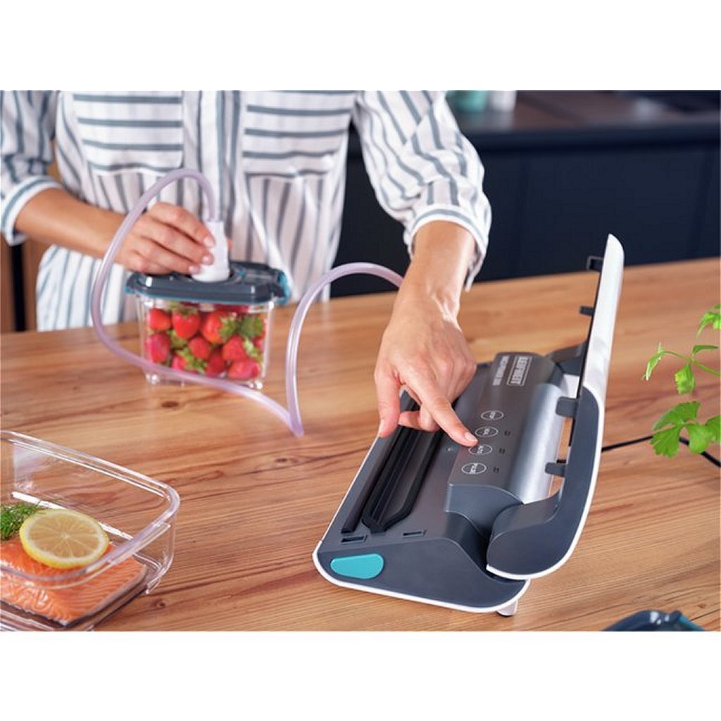 Omdat het bijna al het voedsel vacuüm- en afdicht en ervoor zorgt dat het tot vijf keer langer vers blijft – voor een langere houdbaarheid zonder conserveringsmiddelen.De efficiënte vacuümpomp heeft een capaciteit van negen liter per minuut.Het is praktisch dat de sterkte van het vacuüm individueel kan worden geregeld, omdat het vacuümapparaat van Leifheit is uitgerust met de pulsfunctie.Dit betekent dat zelfs drukgevoelige voedingsmiddelen zoals frambozen probleemloos kunnen worden verpakt.Devacuümmachine is intuïtief te bedienen via het akoestische sensor-touchscreen.Het vacuümproces kan ook worden onderbroken met de stopknop.Verder heeft Vacu Power 300 een aparte afdichtfunctie en elektronische temperatuurbewaking.Dit laatste zorgt voor een veilig gebruik van het apparaat.Naast zakken en rollen kan de Vacu Power 300 ook containers vacuüm trekken.De benodigde slang- en voedselbewaarbakken zijn apart verkrijgbaar.Bij de levering inbegrepen zijn tien gratis vacuümzakken van 20 x 30 cm.In principe kunnen alle gangbare rollen tot een maximale breedte van 30 cm worden gebruikt.