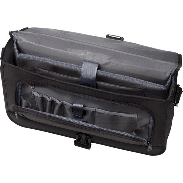 Lightpak schoudertas met trolleyriem en opbergvak aan de achterkant. De voorkant heeft een uitklapbaar compartiment met twee opbergvakken in gaas, organizer gedeelte voor pennen, smartphone ed. Gevoerd laptop compartiment. Ruim hoofdcompartiment. Afmeting 32x43x14x cm. Binnenafmeting ca. 27,5 × 42 × 8 cm. Materiaal polyester.