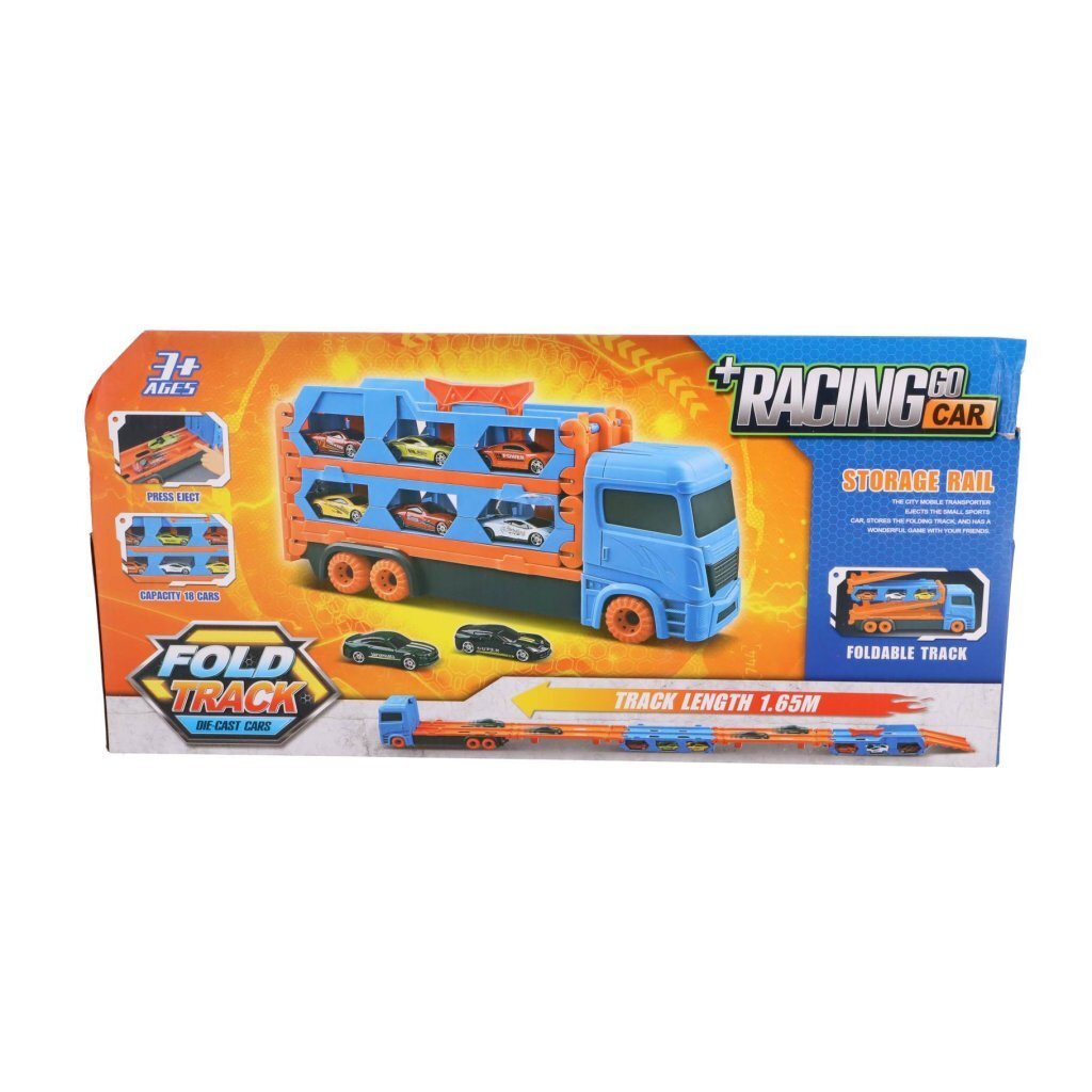 Deze stoere vrachtwagen heeft ruimte voor een heleboel racewagens op zijn aanhanger – je kunt er meer dan 18 auto’s op kwijt! De auto kan ook uitklappen om een racebaan van wel 1.65 meter te vormen! Druk op de knop om je auto’s te lanceren. Inclusief 2 metalen voertuigen. Geschikt voor kinderen vanaf 3 jaar.