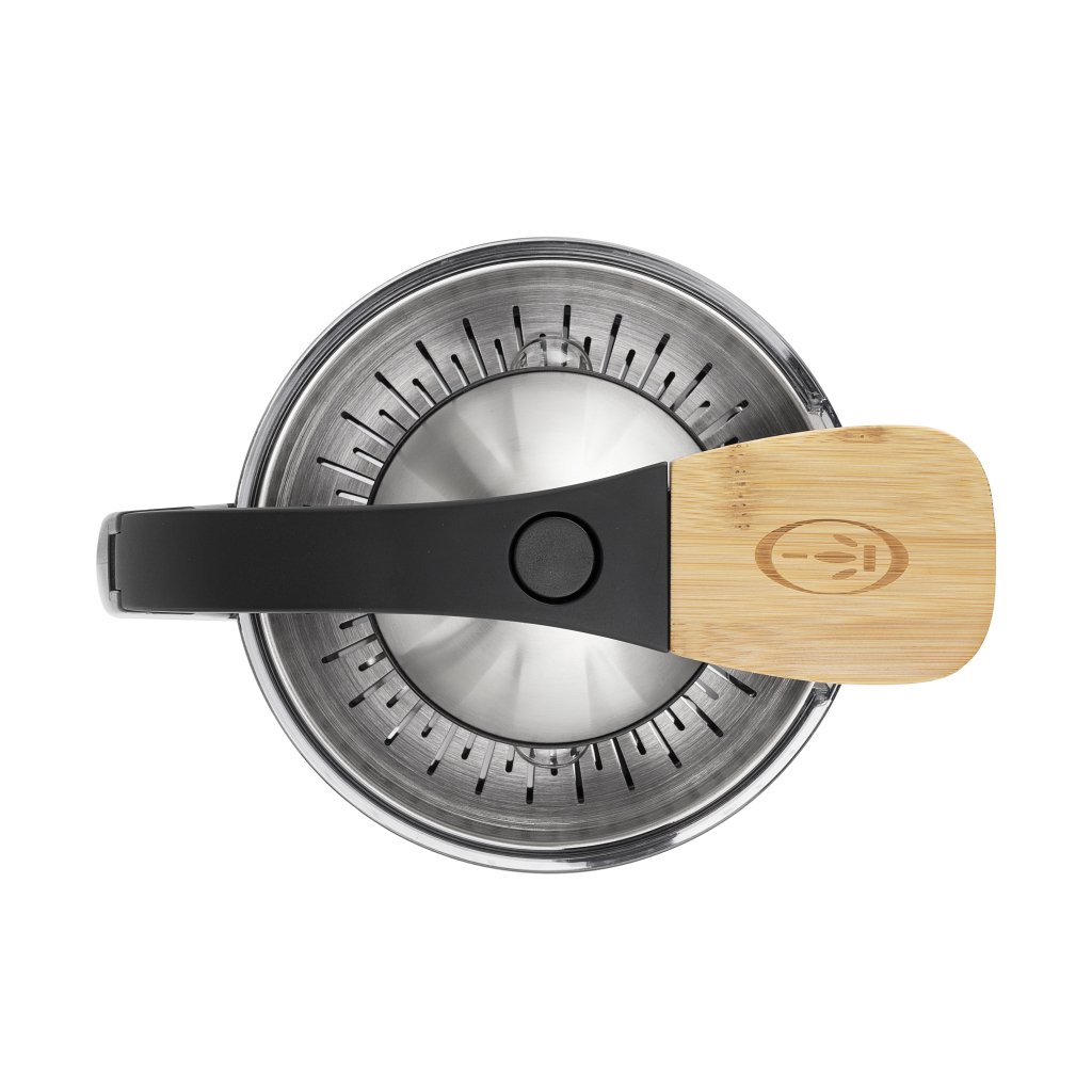 De citruspers is voorzien van een 3-wegtuit, waarbij de neutrale stand fungeert als druppelstop. Druk de tuit naar beneden en pers het sap direct in een glas, ideaal als je maar twee glaasjes nodig hebt! Daarnaast kun je de tuit ook naar boven duwen, hierdoor loopt het geperste sap in de 1 liter kan. Vul de kan met vers sap en serveer het direct aan het hele gezin. Met behulp van het meegeleverde deksel kun je het sap ook meerdere dagen in de koelkast bewaren. Zo heb je zelfs als je weinig tijd hebt een versgeperst sapje klaarstaan!Luxe afgewerkt met bamboe