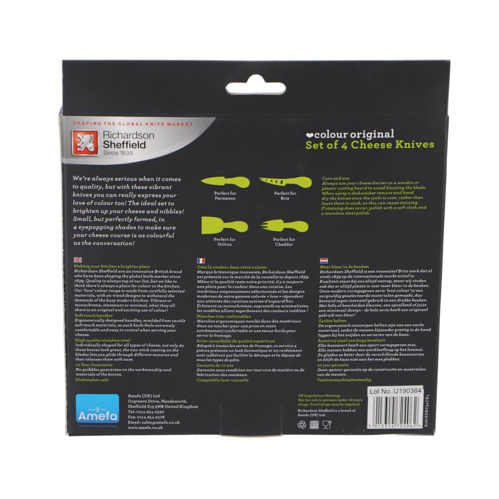 Mooie set met luxe kaasmessen. De messen hebben een kleurrijke en moderne vormgeving waardoor ze een unieke uitstraling hebben. Perfect voor verschillende soorten kazen. Inhoud: 4 stuks.