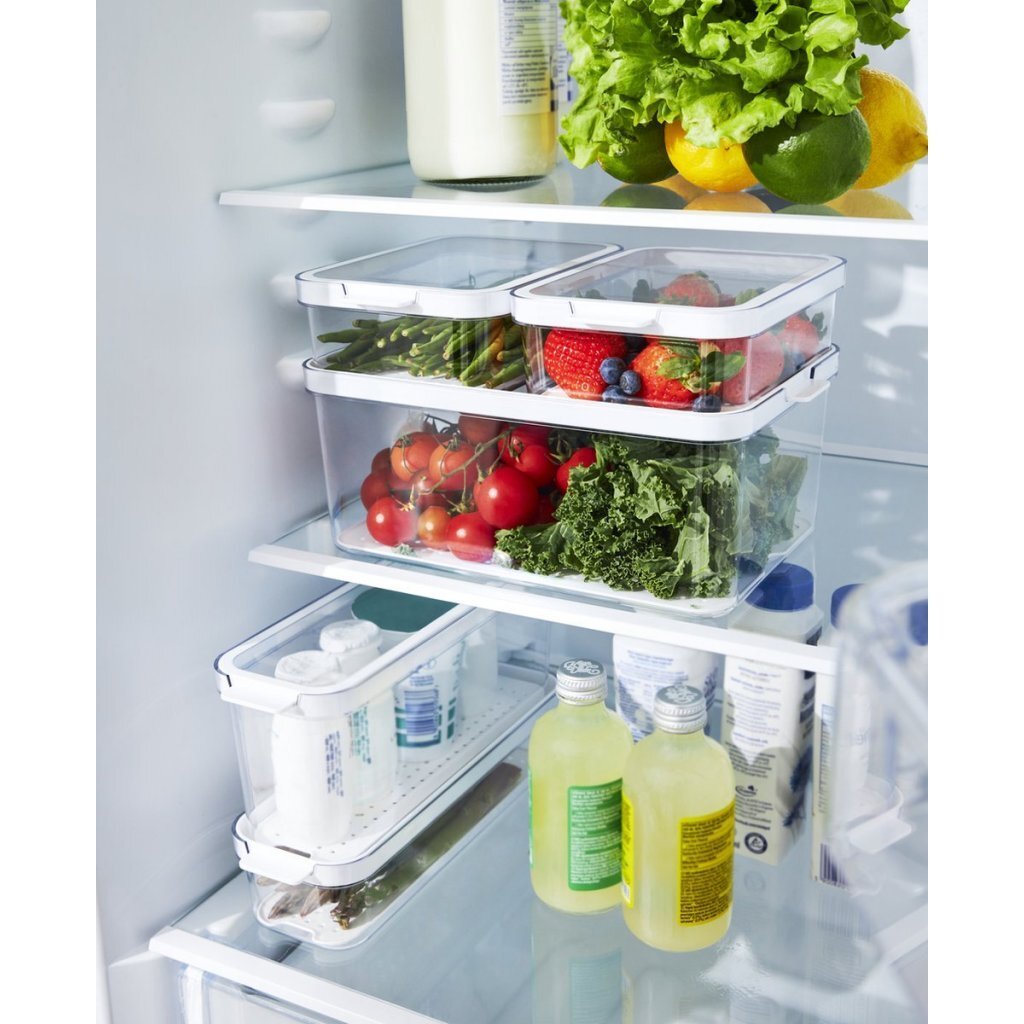 Deze set bestaande uit 4 verschillende formaten kunnen met elkaar worden gecombineerd, waardoor een compact en ruimtebesparend systeem ontstaat. Het inzetstuk met de gaatjes die je kunt verwijderen, laat het vocht weglopen, waardoor het voedsel langer vers blijft en ook beter beschermd is. Je kunt het multifunctionele deksel 180° draaien en dit biedt meer ruimte of perfecte stapelbaarheid. Je kunt ook altijd de inhoud in de gaten houden dankzij de transparante bodem. Richt je koelkast volledig opnieuw in en bespaar tijd bij het zoeken naar het gewenste voedsel. De mogelijkheid om de boxen te gebruiken bij temperaturen tot -20 ? maakt nog meer toepassingsgebieden mogelijk en de boxen kunnen vervolgens eenvoudig in de vaatwasser worden gereinigd. Het fraaie ontwerp van de koelkastorganizers is een blikvanger in je keuken en koelkast.