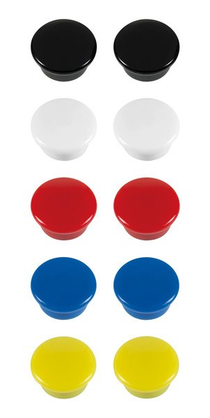 Magneten voor het bevestigen van mededelingen op magneethoudende borden. Leverbaar in verschillende diameters, in diverse kleuren en assorti. 15mm. cap. 4-6 vel 80g papier. Kleur assorti. Blisterkaart à 10 stuks.