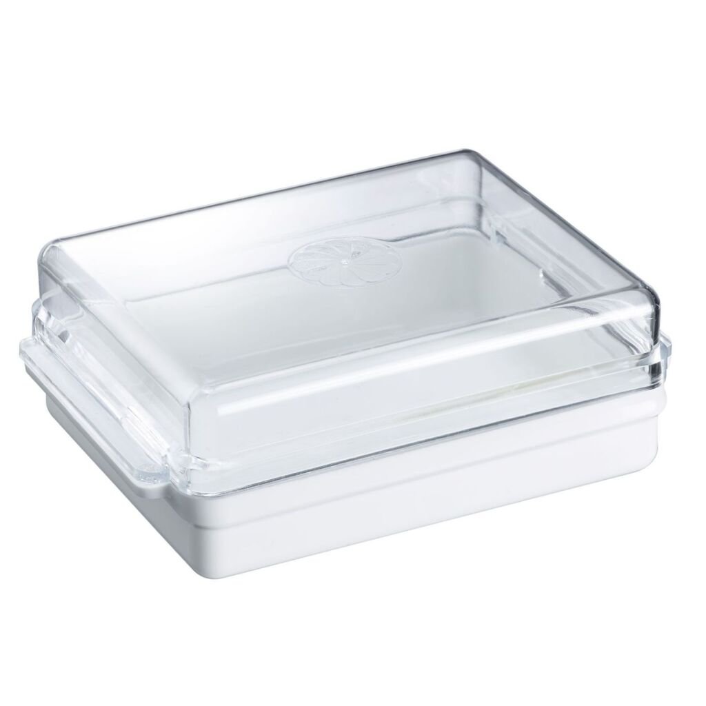 De praktische botervloot van hoogwaardig, robuust kunststof is perfect voor het bewaren en serveren van een stuk boter van 250 gram. Dankzijhet doorzichtige deksel heb je snel overzicht over de resterende boter, en de hoge rand met handige greepelementen zorgt ervoor dat jealtijd een goede griphebt. Handig: deze botervloot past in de gebruikelijke beugels op koelkastdeuren – voor ruimtebesparende opslag. Kleur: transparant/wit.